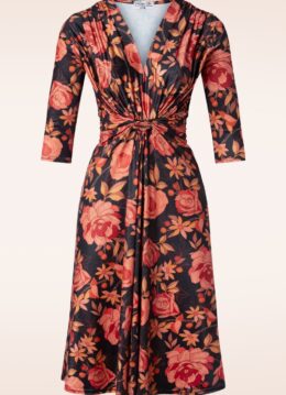 ”I see it, i like it, i want it!” De óh zo comfortabele Luna is uitgevoerd in een soepel en stretchy, licht glanzende, slinky zwarte stof, voorzien van een bloemenprint in verschillende oranjetinten. * Semi-swing model * 3/4 mouwen * V-halslijn * Geknoopt detail onder de buste * Geplooide tailleband * Geen rits of knopen; aantrekken en ready to go! * Valt bij een lengte van 1,70 m net over de knie * Exclusief bij Topvintage verkrijgbaar
