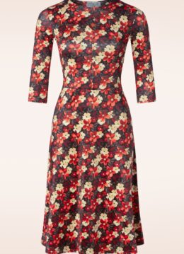 ”A swing of vintage charm in full bloom!” Deze fleurige jurk heeft een boothals halslijn, 3/4 mouwtjes en loopt uit in een flowy swing rok. Ze is uitgevoerd in een soepele en stretchy crêpe achtige stof in rood met prachtige rozenprint in herfstachtige kleuren. * Swing stijl * Boothals halslijn * Gevoerde top voor extra comfort * 3/4 mouwen * Blinde rits achterzijde * Valt over de knie bij een lengte van 1,70 m * Exclusief bij Topvintage verkrijgbaar * Melissa is 1,78 m