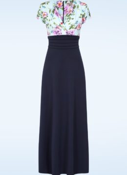 Deze Rinda floral maxi jurk heeft een echte ‘WOW’ factor! Deze pracht van een jurk heeft een aansluitende, lichtblauwe top met bloemenprint en een geplooide overslag, een flatterende geplooide tailleband en loopt vanaf de daar uit in een zwierige maxi rok in marineblauw. Ze is uitgevoerd in een soepele en stretchy, stof die heerlijk draagt. Voel je MAXImaal speciaal in Rinda! * Maxi stijl * Gevoerde top * Vaste, geplooide overslag * Korte mouwen * Geplooide tailleband * Blinde rits achterzijde * Reikt tot aan de grond bij een lengte van 1,70 m * Exclusief bij Topvintage verkrijgbaar