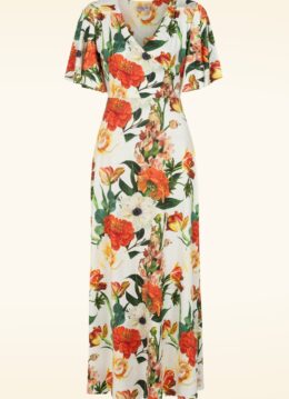 “Soft florals, flowing fabric, and a heart ready for adventure.” Beauty Scarlet heeft een prachtig geplooide overslagtop met een verleidelijke V-hals en speelse vlindermouwtjes. Vanaf de taille vloeit ze moeiteloos over in een zwierige maxirok die elegant met je meebeweegt. Ze is gemaakt van een gladde, soepele, licht glanzende en stretchy slinky stof in gebroken wit met een prachtige bloemenprint, die niet alleen heerlijk draagt maar ook vrijwel kreukvrij blijft. * Maxi jurk * Gevoerde top * Vaste overslag met plooitjes * Korte vlinder mouwtjes * Geen rits of knopen; aantrekken en ready to go! * Reikt tot op de enkel bij een lengte van 1,70 m * Exclusief bij Topvintage verkrijgbaar