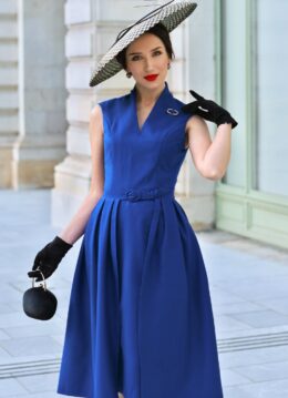 “From sleek sophistication to flowing glamour… one switch, all eyes on you!” Dit seizoen bracht vintage fashion influencer Barinovael haar visie en ontwerpen tot leven, met de expertise van het Vintage Diva team als perfecte partner in deze prachtige samenwerking. Deze mouwloze curve hugging beauty heeft een afneembare overrok die net dat extra vleugje drama toevoegt. Uitgevoerd in een stevige, high quality, koningsblauwe stof met een lichte stretch, zodat ze perfect in vorm blijft en niet aftekent. “A moment of elegance, a dash of drama… one dress, endless poise!” * Aansluitend model * Afneembare overrok met plooien * Gevoerde top met ‘opstaand’ kraagje * Split aan de achterzijde * Blinde rits aan de achterzijde * Elisabeth (Barinovael) is 1,67 m: haar pumps en accessoires zijn haar eigen treasures * Exclusief bij Topvintage verkrijgbaar * Let op; de kleur van het product op de video kan afwijken van de daadwerkelijke kleur van het product