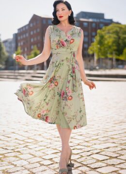 Met deze 50s Jane Floral Midi Dress in Vintage Green creëer je de perfecte ‘vintage romance’ look! Lovely Jane *zucht*… Wanneer je Jane aantrekt weet je het meteen; ze is perfect. Ze laat je op en top vrouw voelen door de prachtige aansluitende overslag top met een sexy V-halslijn, V-rug, speelse strikbandjes en haar flatterende plooien aan de zijkant. De zwierige semi-swing rok en brede schouderbanden zorgen voor een flinke portie elegantie, wow! Ze is uitgevoerd in een glad en soepel, licht glanzend, vintagegroen stretchy stofje met een prachtige bloemenprint dat garant staat voor veel kreukvrij draagplezier. Jane is liefde, pure jurken-liefde! * Semi-swing model * V-halslijn * V-rug * Vaste overslag * Brede schouderbanden * Vaste strikbandjes * Gevoerde top * Geen rits of knopen * Valt bij een lengte van 1,70 m over de knie