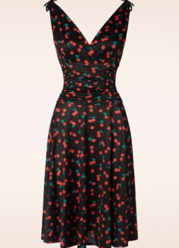 In deze Grecian jurk blijf je niet onopgemerkt! De top heeft zowel aan de voor- als achterzijde een diepe V met mooie overslag waardoor je een sexy decolleté laat zien, oh la la! De licht geplooide cups lopen door in brede schouderbandjes met een speels strikdetail op de schouder. Uitgevoerd in een glad, soepel en stretchy, zwart slinky stofje dat bezaaid is met sappige kersjes en heerlijk draagt. ”You’re the cherry on top!” * Zwierig model * Gevoerde top * Vaste overslag * Vaste strikbandjes * Geen rits of knopen; aantrekken en ready to go! * Valt bij een lengte van 1,70 m over de knie