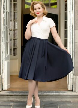 ‘Focused and fabulous!” Dit seizoen hebben onze getalenteerde in-house designers zich laten inspireren door draagbare en klassieke silhouetten met een White Collar Edge; items voor de power vrouw die de zakenwereld omver blaast met haar hyper vrouwelijke silhouet. Glenda is uitgevoerd in een stevige maar toch soepele stof in ivoorwit en navyblauw met een lichte stretch die gracieus met je meebeweegt! * Swing stijl * V-halslijn * Puntig revers kraagje * Korte mouwtjes met vaste omslagjes * Vaste, gevoerde overslag top (voorkomt doorschijnen) * Platte plooien op de rok * Blinde rits aan de achterzijde * Afneembare matching sash voor een extra ‘snatched’ taille * Gorgeous Sylvana van Schaik is 1,65 m: haar pumps zijn haar eigen treasures