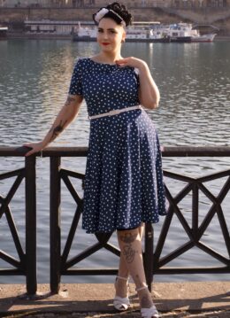 Deze Hilly Hearts Swing Dress in Navy laat ons hartje op hol slaan! Ze heeft een elegante boothals, korte mouwen en een ivoorwit ‘faux’ lak leren riempje dat je taille perfect benadrukt. Vanaf de taille loopt ze uit in een zwierige swing rok waardoor er een super vrouwelijk silhouet ontstaat. Uitgevoerd in een soepele en stretchy, navyblauwe stof, bezaaid met hartjes, die heerlijk draagt. L-O-V-E! * Swing model * Gevoerde top * Boothals * Korte mouwen * Afneembare riem * Blinde rits achterzijde * Valt over de knie bij een lengte van 1,70 m