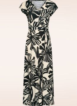 “Bold lines, bold vibes.” Deze groovy midaxi jurk is uitgevoerd in een stretchy en zachte stofmix voorzien van een grafische print van bladeren in zwart en gebroken wit. * V-hals * Overslag met verborgen drukknoopje * Korte kapmouwtjes * Afneembaar striklint voor een extra ‘snatched’ taille * Geen rits of knopen; aantrekken en ready to go! * Valt bij een lengte van 1,70 m tot halverwege de kuit