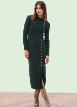 “Curve-loving knit, statement gold buttons… this maxi isn’t here to blend in.” Ze heeft lange mouwen, een hoge ronde halslijn en opvallende, goudkleurige sierknopen aan de voorzijde. Uitgevoerd in een iets stevige, ribgebreide katoenmix in dennengroen met een vleugje kasjmier. * Maxi jurk * Aansluitende fit * Lange mouwen * Split voorkant * Goudkleurige sierknopen voorkant * Geen rits of knopen; aantrekken en ready to go! * Reikt tot de enkel bij een lengte van 1,70 m