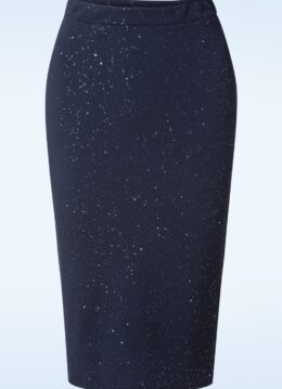 ”Sparkle all day long!” Elegant hoog taille model, uitgevoerd in een stretchy navyblauw stofje dat je rondingen perfect benadrukt terwijl ze bezaaid is met zilverkleurige glitters. * Hoog taille model * Geen rits of knopen * Valt over de knie bij een lengte van 1,70 m