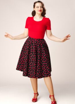 “Where retro swing meets cherry delight.” Shelvia is exclusief verkrijgbaar bij Topvintage en met liefde door onze eigen in-house designers ontworpen. Ze is uitgevoerd in een stevige maar soepel vallende, luchtige katoenmix in zwart met een lichte stretch, voorzien van een rode kersenprint. * Full swing * It has pockets! * Blinde haak- en ritssluiting achterzijde * Valt bij een lengte van 1,70 m over de knie * Exclusief bij Topvintage verkrijgbaar