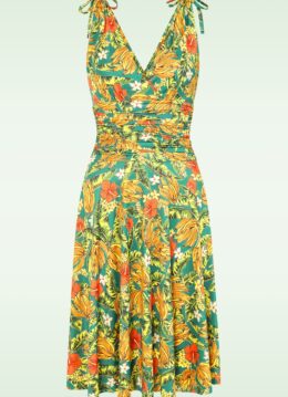 “Banana leaves & blooms, all day long.” In deze Grecian jurk blijf je zeker niet onopgemerkt! De top heeft zowel aan de voor- als achterzijde een diepe V met mooie overslag, waardoor je een sexy decolleté laat zien, oh la la! De licht geplooide cups lopen door in brede schouderbandjes met een speels strikdetail op de schouder. Uitgevoerd in een glad, soepel en stretchy slinky stofje met een tropische print van bloemen, palmbladeren en bananen, dat heerlijk comfortabel draagt. * Zwierig model * Gevoerde top * Vaste overslag * Vaste strikbandjes * Flaterende geplooide tailleband * Geen rits of knopen; aantrekken en ready to go! * Valt bij een lengte van 1,70 m over de knie * Exclusief bij Topvintage verkrijgbaar