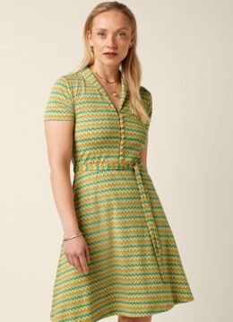 Deze Emmy jurk is alles wat je nodig hebt dit seizoen! Ze is speels maar toch heel vrouwelijk door haar aansluitende top, flatterende korte mouwtjes en reeks knoopjes. De taille wordt mooi geaccentueerd door het striklint vanwaar ze uitloopt in een flowy rok. Uitgevoerd in een heerlijk soepele en stretchy bio katoenmix met een retro print in geel en groentinten. * V-halslijn met omslagkraagje * Korte mouwen * Knopenrij * Afneembaar striklint voor een extra ‘snatched’ taille * Valt bij een lengte van 1,70 m boven de knie