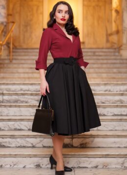 “Confidence twirls best in red and black.” Dit seizoen hebben onze getalenteerde in-house designers zich laten inspireren door draagbare en klassieke silhouetten met een White Collar Edge; items voor de power vrouw die de zakenwereld omver blaast met haar hyper vrouwelijke silhouet. Dianne is uitgevoerd in een stevige maar toch soepele, rood/zwarte stof met een lichte stretch die gracieus met je meebeweegt! ”This swing dress isn’t just fashion—it’s a power move.” * Swing stijl * V-halslijn * Puntig revers kraagje * 3/4 mouwtjes met puntige omslagjes * Gevoerde top * Zijwaartse steekzakjes * Blinde rits aan de achterzijde * Lira Karina is 1,56 m: haar pumps en accessoires zijn haar eigen treasures