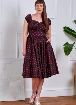 Voel je de allermooiste in deze Marilyn jurk! Uitgevoerd in een luchtige, zwarte katoenmix met een lichte stretch en rode dots. * Swing stijl * Subtiele sweetheart halslijn * Elastische schouderbanden * Kan off-shoulder gedragen worden * Plooitjes bij de buste * It has pockets! * Rits- en haaksluiting achterzijde * Valt bij een lengte van 1,70 m over de knie