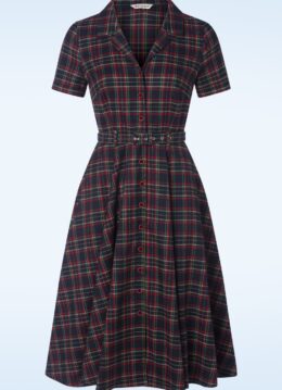 ”Merry everything and happy always!” Straal tijdens de feestdagen in deze Merry Holidays jurk! Ze heeft een elegante V-halslijn, reverskraagje, korte mouwen en loopt uit in een swing rok, die jou een prachtig vrouwelijk silhouet geeft! Uitgevoerd in een soepele en luchtige marineblauwe stof met een vleugje viscose (stretcht niet) en voorzien van gekleurde ruitjes.   * Swing model * V-halslijn * Reverskraagje * Korte mouwen met vaste omslagjes * Voorzien van goudkleurige knoopjes met rood fluweel  * Afneembare riem * Zijwaartse steekzakken * Valt bij een lengte van 1,70 m tot halverwege de kuit