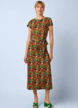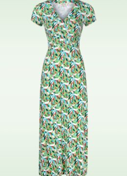 “Your go-to maxi for every sunny adventure.” Tammy heeft een prachtige aansluitende overslagtop met flatterende plooitjes, korte vlindermouwtjes en loopt vanaf de taille over in een flowy maxirok. Je neemt haar bovendien probleemloos overal mee naartoe… ze is namelijk uitgevoerd in een soepele en stretchy, slinky stof met een lichte glans die licht van gewicht is en niet kreukt, in groen met een kleurrijke bloemenprint in groen-, beige- en lichtblauwtinten. * Maxi jurk * Vaste overslag met plooitjes * Gevoerde top * Korte vlindermouwtjes * Afneembaar matching striklint * Geen rits of knopen; aantrekken en ready to go! * Reikt bij een lengte van 1,70 m tot aan de grond * Exclusief bij Topvintage verkrijgbaar