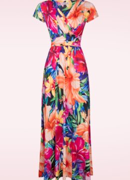 ”Not all flowers belong in a vase!” Deze maxi jurk mag niet ontbreken in je garderobe dit seizoen! Ze draagt uiterst comfortabel door de soepele, licht glanzende en stretchy, roze slinky stof en is voorzien van een prachtige print met kleurrijke bloemen, vlinders en ijsvogels. Tevens staat ze garant voor veel kreukvrij draagplezier. * Korte vlindermouwtjes * Geplooide tailleband * Volledig gevoerd * Geen rits of knopen; aantrekken en ready to go! * Reikt bij een lengte van 1,70 m tot aan de grond * Exclusief bij Topvintage verkrijgbaar