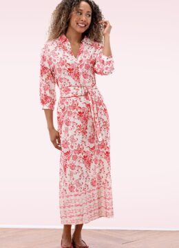 “A dreamy dress for sunlit days.” De keuze is snel gemaakt zodra je deze Sakura Blossom maxi jurk ziet! Ze heeft een elegant puntig kraagje, een vrouwelijke V-halslijn en een strikriem in de taille die je silhouet prachtig accentueert. Uitgevoerd in een soepele en luchtige viscosemix met een StayFresh coating, waardoor ze heerlijk comfortabel draagt. De kleurrijke bloemenprint in rood- en rozetinten op een zachte crèmekleurige basis geeft haar een romantische, bijna dromerige uitstraling. * Maxi jurk * Puntig kraagje * V-halslijn * 3/4 mouwen * Afneembare strikriem * Valt bij een lengte van 1,70 m over de kuit * StayFresh coating * Let op; de kleur van het product op de video kan afwijken van de daadwerkelijke kleur van het product