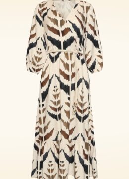 “Desert calm, city cool.” Deze midaxi jurk met overslag is uitgevoerd in stevige, maar toch luchtige beige stof met een vleugje linnen (stretcht niet) en een grafische print in bruin en zwart. * V-hals * Overslag met drukknoopje * 3/4 mouwen met elastiek * Elastische taille * Afneembaar gevlochten lint, voor een extra ‘snatched’ taille * Reikt bij een lengte van 1,70 m tot halverwege de kuit