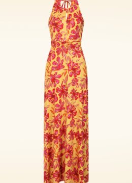 “She moves like summer in full bloom” Vier de zomer in deze geweldige maxijurk! Ze heeft een hoog aansluitende top met een sierlijk strikdetail op de v-rug, een super flatterende geplooide tailleband en loopt vanaf daar uit in een flowy maxirok. Ze is uitgevoerd in een soepele, stretchy en slinky gele stof met een tropische bloemenprint in roze- en roodtinten. * Maxi jurk * Gevoerde top voor extra comfort * Vaste strikbandjes v-rug * Super flatterende, geplooide tailleband * Geen rits of knopen; aantrekken en ready to go! * Reikt bij een lengte van 1,70 m tot aan de grond * Exclusief bij Topvintage verkrijgbaar