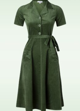 Voeg wat ‘fourties flair’ toe aan je garderobe! Ze heeft een V-halslijn met een speels revers kraagje, korte pofmouwen en een reeks grote knopen. Het striklint accentueert je taille voor een super vrouwelijk silhouet. Uitgevoerd in stevig maar soepel en zacht, vintagegroen ribfluwelen katoen (stretcht niet) dat heerlijk draagt. Slaat jouw vintage hartje ook al op hol? 😉 * Semi-swing model * V-halslijn * Revers kraagje * Korte pofmouwen * Reeks knopen voorzijde * Afneembaar striklint * Zakken voorzijde * Blinde rits zijkant * Valt bij een lengte van 1,70 m over de knie