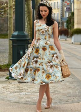 ”Ready to blossom and bloom?!” Mavis heeft een classy sweetheart halslijn, een zwierige swing rok en handige zijwaartse steekzakken. Uitgevoerd in een stevige maar luchtige, grijsblauwe katoenmix met een lichte stretch die heerlijk draagt en bezaaid is met een print van goudbruine bloemen in 3D effect. “Perfect for dancing and romancing!” * Full swing model * Sweetheart halslijn * Steekzakjes * Blinde rits achterzijde * Combineer met een van onze petticoats voor een extra feestelijk effect * Valt over de knie bij een lengte van 1,70 m