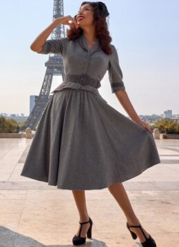 “A tribute to timeless femininity; where soft tailoring meets the romance of Parisian winters.” Deze Lylou swing jurk uit de nieuwe collectie is geïnspireerd op de extraordinaire Marie-Louise Carven; Een baanbrekende Franse couturière uit de jaren 40 en 50! Ze is uitgevoerd in een stevige, maar soepel vallende grijze stof met een zwart tartan ruitje (stretcht amper) dat heerlijk draagt. * Swing model * Kraagje * 3/4 pofmouwen met manchetten * Flatterende plooitjes bij de buste * Functionele knopenreeks met verborgen drukknoopje * Afneembare riem, voor een extra ‘snatched’ taille * Voorzien van zakken! * Valt bij een lengte van 1,70 m over de knie