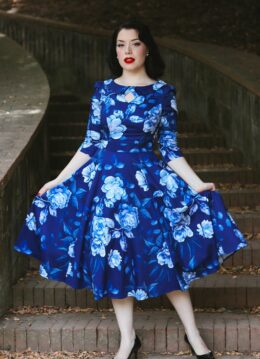 Dorothy swing jurk in blauw“Wearing this floral dress is like being hugged by a garden, minus the thorns!” 😉 Uitgevoerd in een stevige maar toch soepele blauwe katoenmix met een fijne stretch voorzien van aquarel achtige bloemenprint in wit en lichtblauw die heerlijk draagt. * Kraagje met sierknoopjes * Opengewerkt ruitvormig detail * 3/4 mouwen * It has pockets! * Blinde ritssluiting in de zijnaad * Te combineren met een petticoat voor een extra feestelijk effect * Valt bij een lengte van 1,70 m over de knie