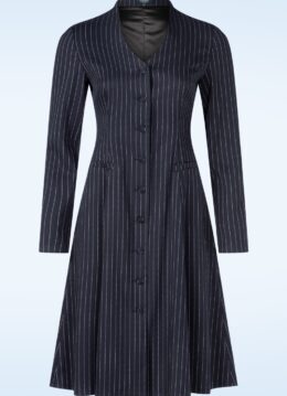 “Smart, sleek, and unapologetically feminine!” De prachtige Gennifer jurk heeft een flatterende V-halslijn, lange mouwen en loopt vanaf de taille subtiel uit in een semi-swing rok. Uitgevoerd in een stevige maar soepel vallende donkerblauwe stof met witte pinstripes, die heerlijk comfortabel draagt. Perfect voor zowel kantoorlooks als chique casual outfits. * Swing jurk * V-halslijn * Gevoerd * Stoffen knopenreeks * Voorzien van zakken! * Valt bij een lengte van 1,70 m over de knie