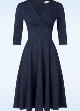 Feestdagen of gewoon een dagje full glamour? Glinda is jouw sidekick! Uitgevoerd in een soepele en stretchy, marineblauwe stof voorzien van zilverkleurige glitters. “Glinda is all glitz and glam honey!” * Swing model * Vaste, geplooide overslag * 3/4 mouwen * Brede tailleband * Blinde rits achterzijde * Valt bij een lengte van 1,70 m over de knie