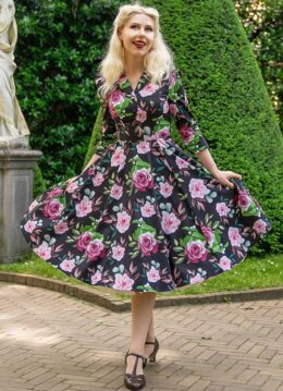 “Wearing this floral dress is like being hugged by a garden, minus the thorns!” 😉 Uitgevoerd in een soepele en stretchy, zwarte katoenmix voorzien van een oogverblindende rozenprintprint die heerlijk draagt. * Swing jurk * Puntig kraagje * Voorzien van decoratieve knopen * 3/4 mouwen * Voorzien van zakken! * Blinde ritssluiting aan de zijkant * Te combineren met een petticoat voor een extra feestelijk effect * Valt bij een lengte van 1,70 m over de knie