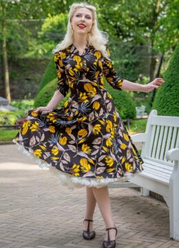 “Wearing this floral dress is like being hugged by a garden, minus the thorns!” 😉 Uitgevoerd in een soepele en stretchy, zwarte katoenmix voorzien van een oogverblindende bloemenprint in geeltinten en een vleugje blauw die heerlijk draagt. * Swing jurk * Puntig kraagje * Voorzien van 3 decoratieve knopen * 3/4 mouwen * Voorzien van zakken! * Blinde ritssluiting aan de zijkant * Te combineren met een petticoat voor een extra feestelijk effect * Valt bij een lengte van 1,70 m over de knie