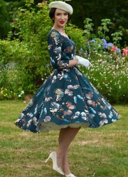 “Flutter into effortless elegance!” Deze petrolblauwe swing jurk heeft een subtiele sweetheart halslijn, 3/4 pofmouwen en handige zakken voor een speels en praktisch detail. Uitgevoerd in een zachte, soepele katoenmix en versierd met een dromerige vlinderprint, brengt ze instant retro charme en vrouwelijkheid in je look. * Swing jurk * Subtiele sweetheart halslijn * 3/4 pofmouwen * Afneembare riem * Voorzien van zakken! * Blinde ritssluiting aan de zijkant * Te combineren met een petticoat voor een extra feestelijk effect * Valt bij een lengte van 1,70 m over de knie