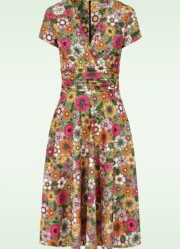 Voel je op en top vrouw in deze Colette Floral swing jurk! Ze heeft een prachtige geplooide overslagtop met een sexy V-halslijn en een sierlijk strikdetail in de taille. De flatterende swing rok en 3/4 mouwen zorgen voor een flinke portie elegantie, wow! Ze is uitgevoerd in een glad en soepel, licht glanzend, stretchy, kaki stofje voorzien van een kleurrijke bloemenprint en dat garant staat voor veel kreukvrij draagplezier. Geniet van de complimentjes die je krijgt, zodra je Colette draagt! * Swing stijl * Vaste gevoerde overslag * 3/4 mouwen * Vaste strikbandjes * Geen rits of knopen; aantrekken en ready to go! * Exclusief bij Topvintage verkrijgbaar * Valt bij een lengte van 1,70 m over de knie