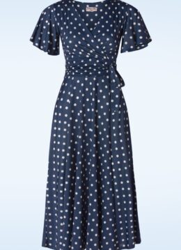 Topvintage exclusive ~ Irene polkadot overslag swing jurk in marineblauw