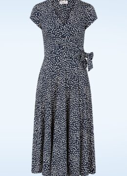 Hoe mooi is deze Irene jurk?! Ze is uitgevoerd in een glad en soepel, licht glanzend, stretchy, donkerblauw slinky stofje dat bezaaid is met witte polkadots, licht van gewicht is en garant staat voor veel kreukvrij draagplezier. Irene is liefde, pure jurken-liefde! * Gevoerde top voor extra comfort * Vaste overslag * Vaste strikbandjes * Geen rits of knopen; aantrekken en ready to go! * Exclusief bij Topvintage verkrijgbaar * Valt bij een lengte van 1,70 m tot ruim over de knie