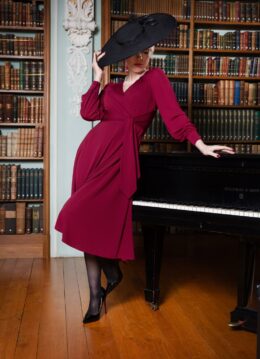 ”A wrap of red… she tied the dress and the room fell silent!” Deze flowy wikkeljurk is ontworpen door onze eigen in-house ontwerpers en is een ode aan tijdloze elegantie, geïnspireerd door de iconische stijl van Ava Gardner en haar ongedwongen charme in de film ‘Barefoot Contessa’ uit 1954. Ze heeft een V-hals met overslag, lange, licht poffende mouwen met manchetten en een vaste strikband in de taille vanwaar ze uitloopt in een flowy overslag rok. Uitgevoerd in een gladde, soepele en stretchy bordeauxrode stof. “Soft in fabric. Sharp in effect.” * Overslag jurk * Gevoerde top  * Lange, licht poffende mouwen met manchetten * Vaste strikbanden voor een extra ‘snatched’ taille * Rok met overslag * Blinde rits in de zijnaad * Gorgeous Julia Fiore (Fiorevanil) is 1,70 m; haar accessoires zijn haar eigen vintage treasures * Let op; de kleur van het product op de video kan afwijken van de daadwerkelijke kleur van het product