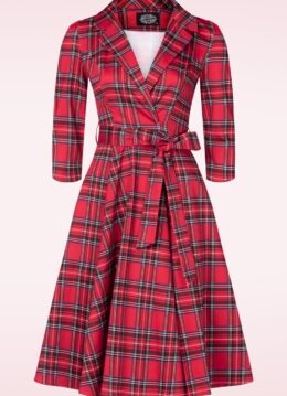 “Swing into tartan dream!” Zwier elegant in deze charmante swing jurk met klassieke tartan ruit. Exclusief verkrijgbaar bij Topvintage, heeft ze een chique reverskraag met vaste overslag en loopt vanaf de taille uit in een zwierige swingrok die sierlijk met je meebeweegt bij elke stap. Uitgevoerd in een stevige maar soepel vallende rode katoenmix, die comfortabel draagt en perfect is voor zowel dagelijkse looks als feestelijke gelegenheden. Een retro-geïnspireerde must-have die je garderobe een speelse, stijlvolle twist geeft.   * Swing jurk * Revers kraag * Vaste overslag * 3/4 pofmouwen * Voorzien van zakken! * Afneembaar striklint, voor een extra ‘snatched’ taille * Blinde ritssluiting aan de zijkant * Te combineren met een petticoat voor een extra feestelijk effect * Valt bij een lengte van 1,70 m over de knie * Exclusief verkrijgbaar bij Topvintage