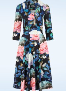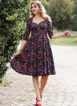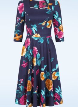 “Where classic beauty meets blooming dreams.” Deze marineblauwe swing jurk straalt tijdloze elegantie uit met haar subtiele sweetheart halslijn en flatterende 3/4 mouwen. De vrouwelijke taille loopt over in een zwierige rok die meebeweegt bij elke stap. Ze is uitgevoerd in een stevige maar soepele katoenmix met een prachtige, kleurrijke bloemenprint — en exclusief verkrijgbaar bij Topvintage.   * Swing jurk * Subtiele sweetheart halslijn * 3/4 pofmouwen * Voorzien van zakken! * Blinde ritssluiting aan de achterzijde * Te combineren met een petticoat voor een extra feestelijk effect * Valt bij een lengte van 1,70 m over de knie * Exclusief bij Topvintage verkrijgbaar!