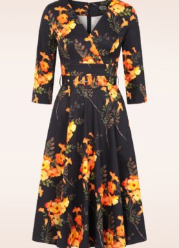 “Fall in love with floral flair”. Deze elegante zwarte swing jurk brengt het warme kleurenpalet van de herfst tot leven met haar prachtige bloemenprint in rijke oranje tinten. Ze heeft een vaste overslag met een flatterende V-halslijn, 3/4 mouwen en een brede tailleband die je figuur op stijlvolle wijze benadrukt. De zwierige rok met handige zakken en de bijpassende riem zorgen voor een vrouwelijke én comfortabele look. Uitgevoerd in een stevige maar soepel vallende katoenmix met een lichte stretch voor een perfecte pasvorm.   * Swing jurk * Vaste overslag * 3/4 mouwen * Voorzien van zakken! * Brede tailleband * Afneembare riem, voor een extra ‘snatched’ taille * Blinde ritssluiting aan de achterzijde * Te combineren met een petticoat voor een extra feestelijk effect * Valt bij een lengte van 1,70 m over de knie * Exclusief bij Topvintage verkrijgbaar!