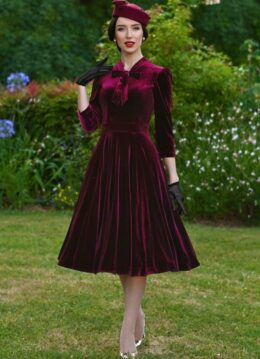 “Velvet dreams, timeless schemes!” Voel je onweerstaanbaar vrouwelijk in deze bordeauxrode velvet swing jurk. Ze heeft een elegante strik in de hals, een flatterende tailleband en een zwierige swingrok die sierlijk met je meebeweegt bij elke stap. Uitgevoerd in een zachte stofmix met de luxe look en feel van fluweel, die soepel valt en heerlijk comfortabel draagt. Perfect voor een chique avondje uit of een feestelijke gelegenheid waarin je wilt stralen. * Swing stijl * Vaste strikbanden * 3/4 pofmouwen * Zijwaartse steekzakjes * Blinde rits zijkant * Barinovael is 1,67 m: haar pumps en accessoires zijn haar eigen vintage treasures