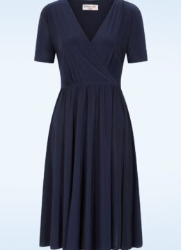 “Simply elegant, endlessly wearable.” Deze semi-swing jurk combineert comfort met een vrouwelijk silhouet. De vaste overslag top is gevoerd en flatterend, terwijl de elastische tailleband heerlijk zit en wordt geaccentueerd door vaste strikbanden, die je zowel voor als achter kunt strikken voor een speelse touch. Ze is uitgevoerd in een glad en soepel, licht glanzend en stretchy marineblauw stofje dat garant staat voor veel kreukvrij draagplezier. Dus ook ideaal om mee op reis te nemen! * Semi-swing model * Vaste overslag top (gevoerd) * Korte mouw * Elastische tailleband * Vaste strikbanden * Valt bij een lengte van 1,70 m net over de knie * Exclusief bij Topvintage verkrijgbaar