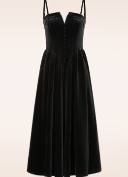 ”Looking fabulous and glamorous!” Deze prachtjurk heeft een subtiele V bij de halslijn, een reeks ‘faux’ knopen en verstelbare schouderbanden. Ze is uitgevoerd in een ietwat dikkere en zwaardere, maar soepele en stretchy, zwarte stof met de look and feel van luxe fluweel, die heerlijk draagt. * Midi jurk * Verstelbare schouderbanden * Reeks ‘faux’ knopen * Blinde rits met haaksluiting achterzijde * Valt bij een lengte van 1,70 m tot over de kuit