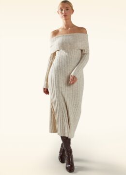 “Soft, sophisticated, and just a little bit sultry.” Deze prachtige midi-jurk bewijst dat knitwear allesbehalve saai is! Ze heeft lange mouwen die off shoulder gedragen worden en een brede omslagkraag die zorgt voor een elegante, vrouwelijke uitstraling. De aansluitende pasvorm accentueert je silhouet op stijlvolle wijze, terwijl het fijngebreide materiaal met brede ribstructuur in zacht beige zorgt voor een luxueuze look én heerlijk draagcomfort. Perfect voor een dinerdate, een dag op kantoor of gewoon wanneer je effortless chic wilt zijn. * Midi jurk met grote omslagkraag * Off-shoulder * Lange mouwen * Geen rits of knopen; aantrekken en ready to go! * Valt bij een lengte van 1,70 m halverwege de kuit