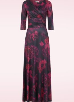 “Wrapped in midnight blooms, dangerous and divine.” Vivian heeft een prachtige aansluitende overslag top met een sexy V-halslijn, 3/4 mouwen en een flatterende geplooide tailleband. Vanaf de taille gaat ze over in een chique lange maxi rok. Ze is uitgevoerd in een glad en licht glanzend, soepel en stretchy, slinky stofje met een all-over faded bloemenprint in de kleuren paars, bordeauxrood en zwart. * Maxi jurk * Vaste overslag * Gevoerde top * 3/4 mouwen * Geplooide tailleband * Geen rits of knopen; aantrekken en ready to go! * Reikt tot op de enkel bij een lengte van 1,70 m