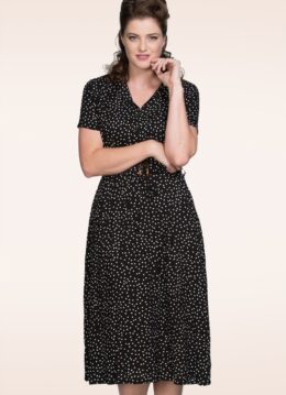 Herleef vervlogen tijden in deze flowy dress! Ze heeft een typische fourties uitstraling met haar V-hals, reverskraagje, korte mouwen, reeks knopen en lange zwierige rok. Uitgevoerd in een luchtige en soepel vallende, zwarte viscose (stretcht niet) bezaaid met witte polkadots dat heerlijk draagt. Wat ‘spot’ ik daar nou? Deze polkadot beauty in je shopping bag?! 😉 * Semi-swing model * V-hals * Reverskraagje * Korte mouwen * Reeks knopen * Afneembare riem voor een extra ‘snatched’ taille * Zijwaartse steekzakken * Ritssluiting achterzijde * Valt bij een lengte van 1,70 m ruim over de knie