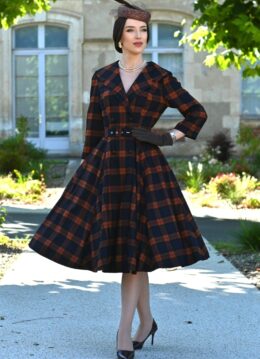“Two looks in one timeless piece!” Dit prachtige herfstitem uit de nieuwe collectie is geïnspireerd op de extraordinaire Marie-Louise Carven, een baanbrekende Franse couturière uit de jaren ’40 en ’50. Ze is een vintage-geïnspireerde beauty die moeiteloos wisselt tussen een opvallend rood en een klassiek grijs ruitpatroon, met prachtige contrasterende biezen. Ze heeft een flatterende fit-and-flare pasvorm, dubbele knopen en een bijpassende ceintuur, waardoor deze manteljurk zowel elegant als praktisch is. En ja, ze heeft zakken aan beide zijden! Uitgevoerd in een stevige, maar soepel vallende stofmix met een vleugje viscose en een hele lichte stretch, waardoor ze heerlijk comfortabel draagt. * Reversible manteljurk * Revers kraag * Functionele knopenreeks voorzijde * Afneembare riem, voor een extra ‘snatched’ taille * Voorzien van zakken * Valt bij een lengte van 1,70 m over de knie