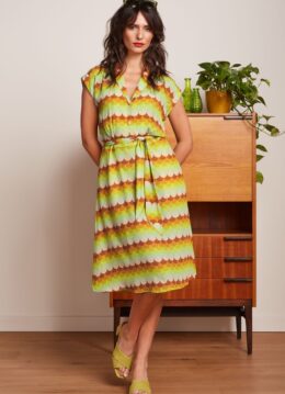 Speels, vrouwelijk en helemaal retro! Uitgevoerd in een heerlijk soepele, luchtige EcoVero viscosemix (stretcht niet!) met een prachtige retroprint in geel, groen, bruin en oranje die garant staat voor veel draagplezier. What’s not to love? 😉 * Midi jurk * Revers kraagje * Reeks knopen * Korte kapmouwen met omslagjes * Afneembare strikriem * It has pockets! * Geen rits * Valt bij een lengte van 1,70 m over de knie