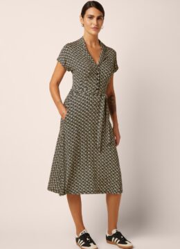 ”Speels, vrouwelijk en helemaal retro!” Ze is uitgevoerd in een heerlijk soepele en luchtige EcoVero viscosemix (stretcht niet!) met een prachtige geometrische retroprint in crème en zwart, die garant staat voor eindeloos draagplezier. What’s not to love? * Midi jurk * Revers kraagje * Reeks knopen * Korte kapmouwen met omslagjes * Afneembare strikriem * It has pockets! * Valt bij een lengte van 1,70 m over de knie