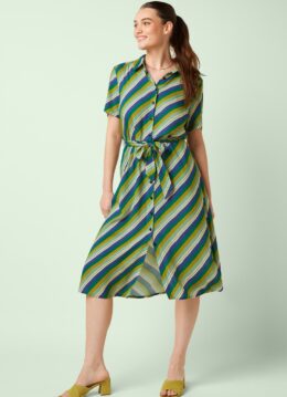 “Stripe it till you like it!” Deze midi doorknoopjurk is speels én vrouwelijk dankzij de top met puntig kraagje, korte mouwen en het afneembare striklint dat je taille prachtig accentueert. Ze is uitgevoerd in een heerlijk soepele EcoVero viscosemix (stretcht niet) met een frisse gestreepte print in groen, crème en blauwtinten. * Midi model * Doorknoopjurk * Puntig kraagje * Korte mouwen * Afneembare strikband voor een extra ‘snatched’ taille * It has pockets! * Reikt bij een lengte van 1,70 m tot op de kuit