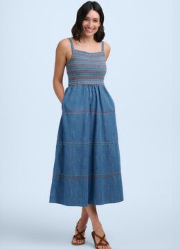 “Easy denim, endless summer energy.” Deze midi denim jurk is een echte everyday favourite met een boho twist. Het bovenstuk is afgewerkt met elastisch smokwerk, waardoor ze mooi aansluit. Het kleurrijke stikwerk geeft haar een speelse, ambachtelijke uitstraling en maakt haar nét even anders dan een klassieke jeansjurk. Gemaakt van stevig maar luchtig 100% katoen in denimblauw, perfect voor aankomend seizoen. * Midi jurk * Top met elastisch smokwerk * Verstelbare schouderbandjes * Zijwaartse steekzakken * Geen rits of knopen; aantrekken en ready to go! * Reikt tot halverwege de kuit bij een lengte van 1,70 m